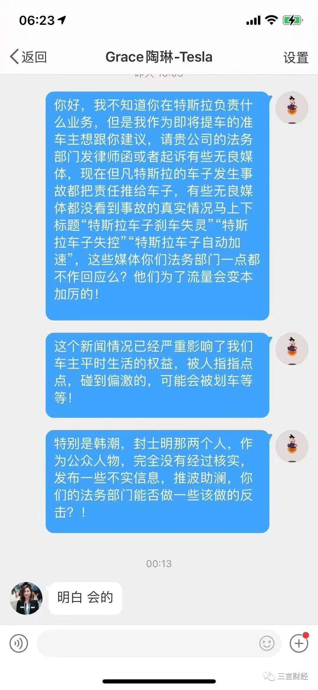 昨天,汽车博主填鸭式教育受害者在微博上发布了一张转自特斯拉群的微博私信截图。图片中显示的是一位自称即将提车的准车主发给特斯拉副总裁陶琳的消息,消息中请特斯拉公司法务部门发律师函或者起诉一些媒体,最后还强调了韩潮和封士明两个人,问陶琳法务部门能不能做一些反击。