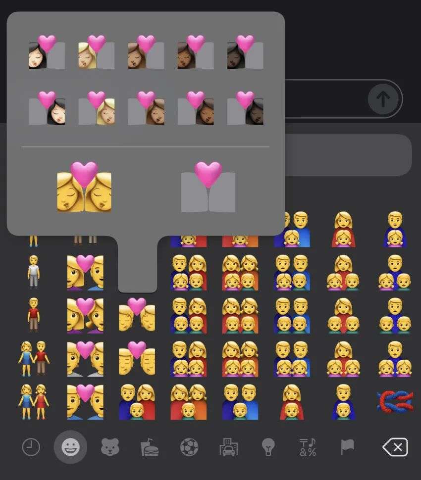 同时,所有亲吻类情侣表情符号和爱心类情侣表情符号中的每个人都可以单独选择肤色。