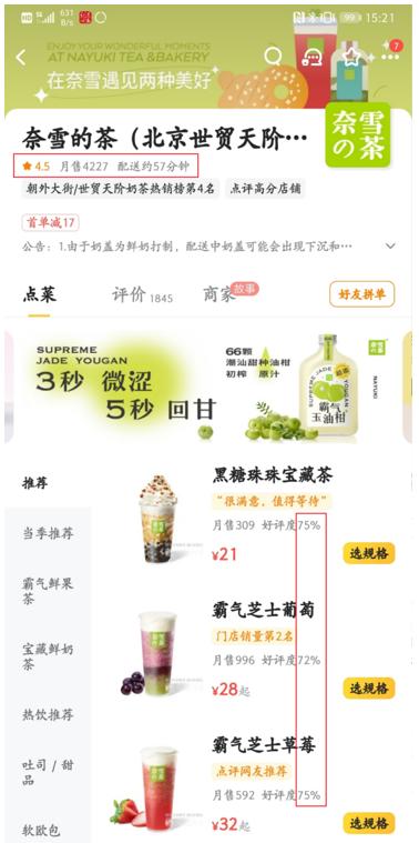 以较为常用的某外卖平台店铺为例,其推荐的单品满意度仅为75%,对应5星好评中的3.8星,低于该店整体4.5星的评分。