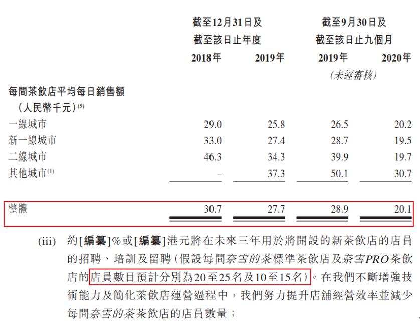 结合单店来看,根据上图以标准店模型最少需要20人估算,2018年及2019年以及截至2019年及2020年前9个月,奈雪の茶单店人均销售额分别为1535.00元、1385.00元、1445.00元、1005.00元。