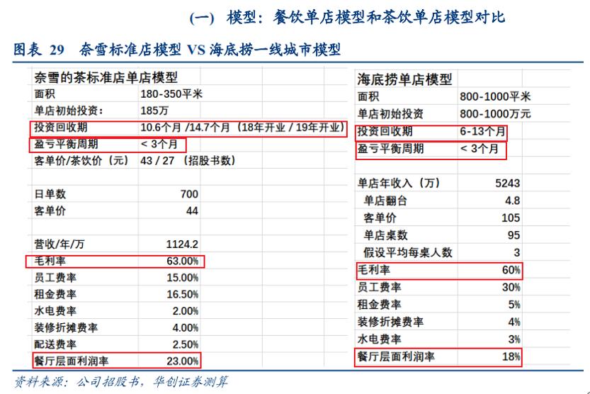 根据华创证券测算,奈雪の茶标准店毛利率仅比海底捞高3个百分点,餐厅层面利润率比海底捞高5个百分点,盈亏平衡周期和海底捞相似,但是投资回收期最短时间比海底捞多4.6个月,最长周期比海底捞多1.7个月,整体而言,投资回报率不如海底捞。
