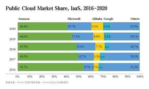 4月21日,国际研究机构Gartner发布最新《Market Share: IT Services, Worldwide 2020》研究报告,云计算IaaS市场保持高速增长,全球市场规模达到643.9亿美元,同比增长40.7%。市场进一步向头部厂商集中,全球云计算3A格局稳固,亚马逊、微软和阿里云排名全球前三。