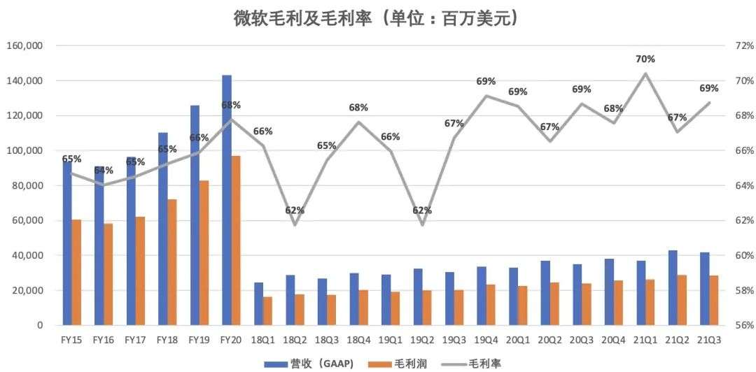 财报显示,2021财年Q3微软毛利为286.61亿美元,较上年同期的240.46亿美元,增长19%,较上一季度的288.82亿美元,减少1%。2021财年Q3毛利率为69%,略高于上一季度的67%,低于一季度的70%。