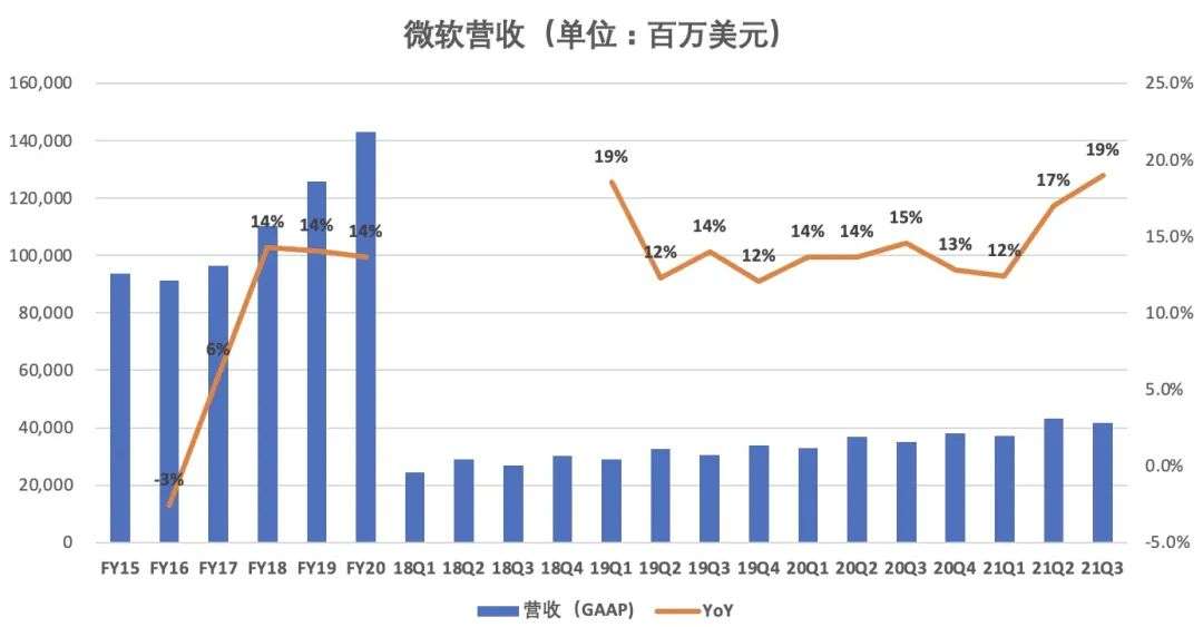 财报显示,微软2021财年Q3营收417.06亿美元,高于市场预期的410.5亿美元,较上年同期的350.21亿美元,增长19%,创2019财年以来最大季度增速。