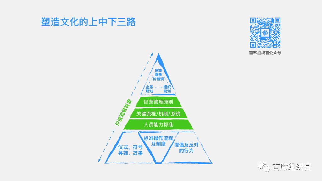 当一个企业有了使命愿景价值观的描述后,如何真正让它落地,就这个问题来说,我们有一个塑造文化的上中下三路框架,其中有很多点是可以做的。