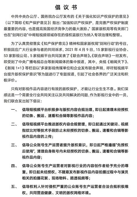 而实际上,就在这之前的4月9日,业内50余家影视公司以及多家影视行业协会也曾发出过一份联合声明,该声明同样是呼吁短视频平台和公众账号生产运营者尊重原创、保护版权,并要求未经授权不得对相关影视作品实施剪辑、切条、搬运、传播。