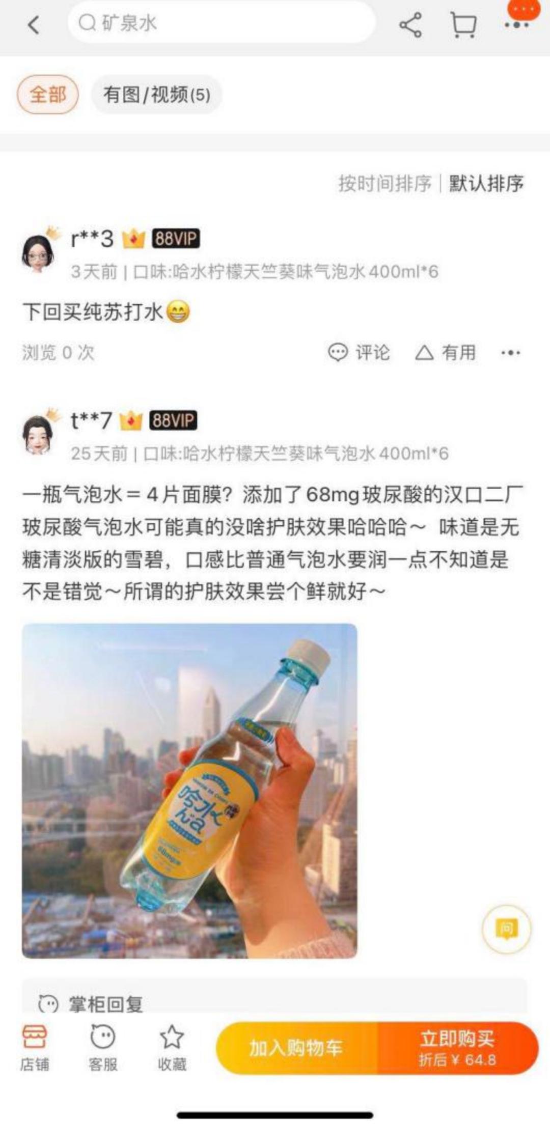 哈水在淘宝月销量200+,喝过的用户留言“汉口二厂玻尿酸气泡水可能没啥护肤效果,尝个鲜就好。”