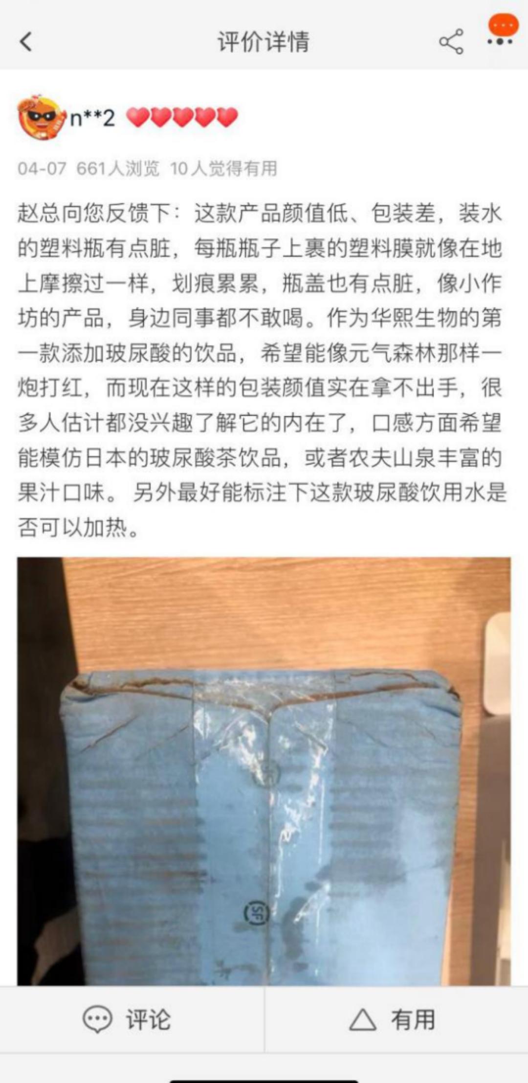 另有消费者表示,“这款产品颜值低、包装差,装水的塑料瓶有点脏,有点小作坊的感觉”,他建议华熙生物调整下水肌泉外观设计,做成类似于元气森林的包装设计。