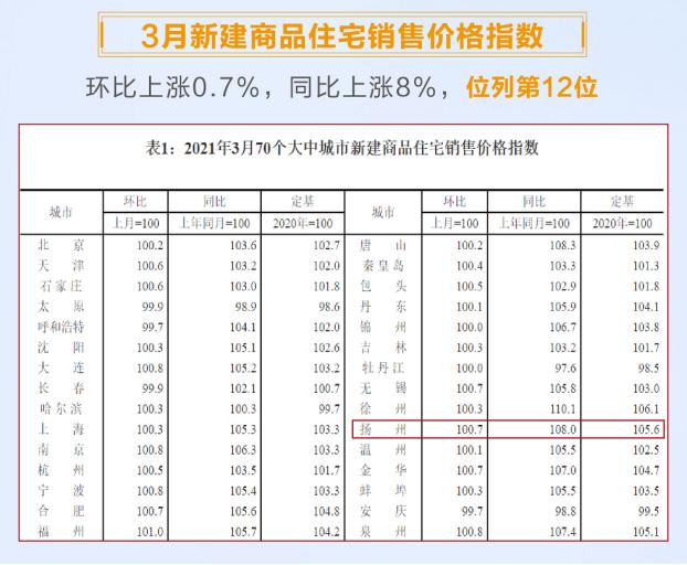 根据国家统计局公布数据,2021年3月,扬州新房销售价格指数环比上涨0.7%,同比上涨8%,在全国70城中位列第12位。