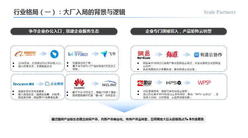 据 Scale Partners 势乘资本&光锥智能研究,巨头代表队在协同办公领域的发展有两种路径:
