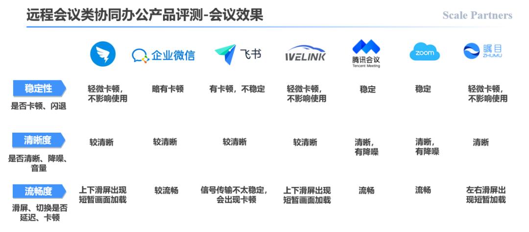整体来说,这些缺陷虽不影响使用,但也妨碍了用户体验,而且这些缺陷还有随着与会人员递增而愈加扩大的风险。从会议效果看,Zoom和腾讯会议性能最稳定,其他产品都有不同程度的瑕疵。