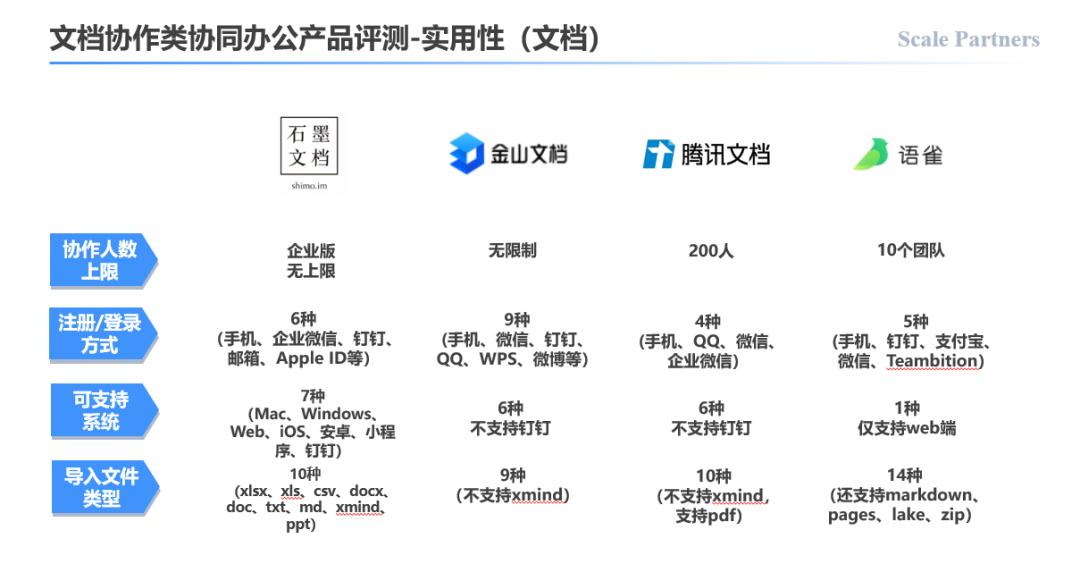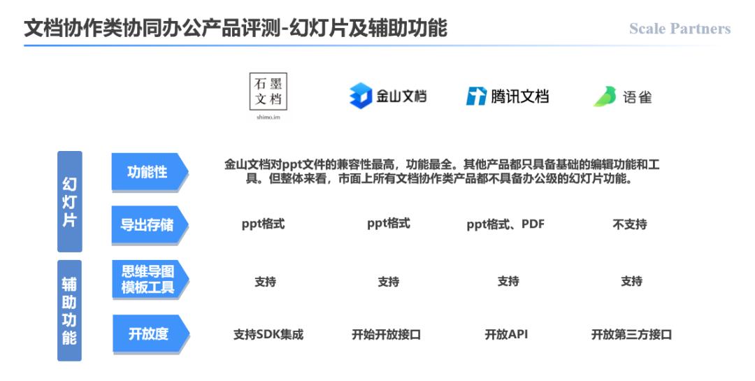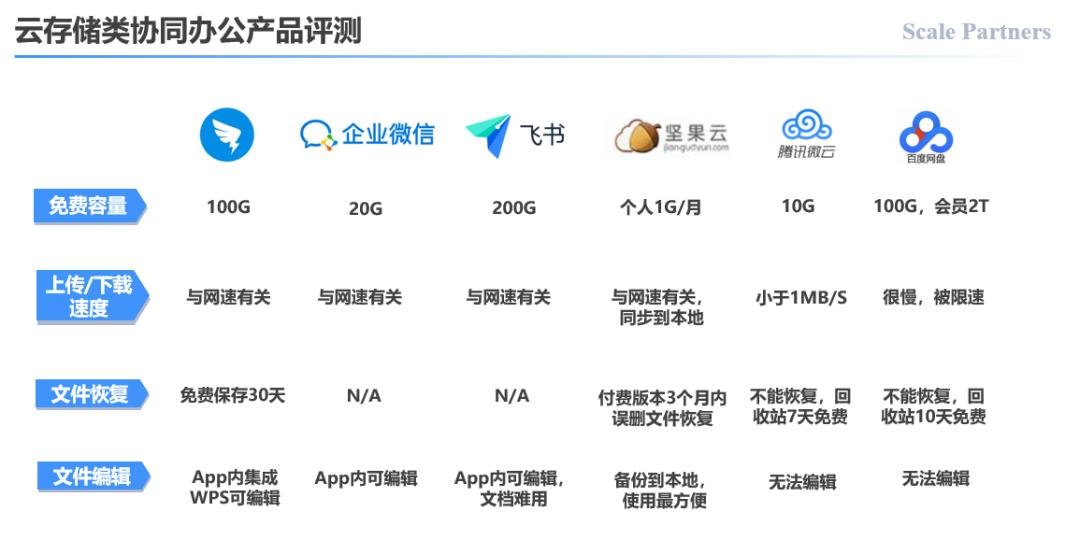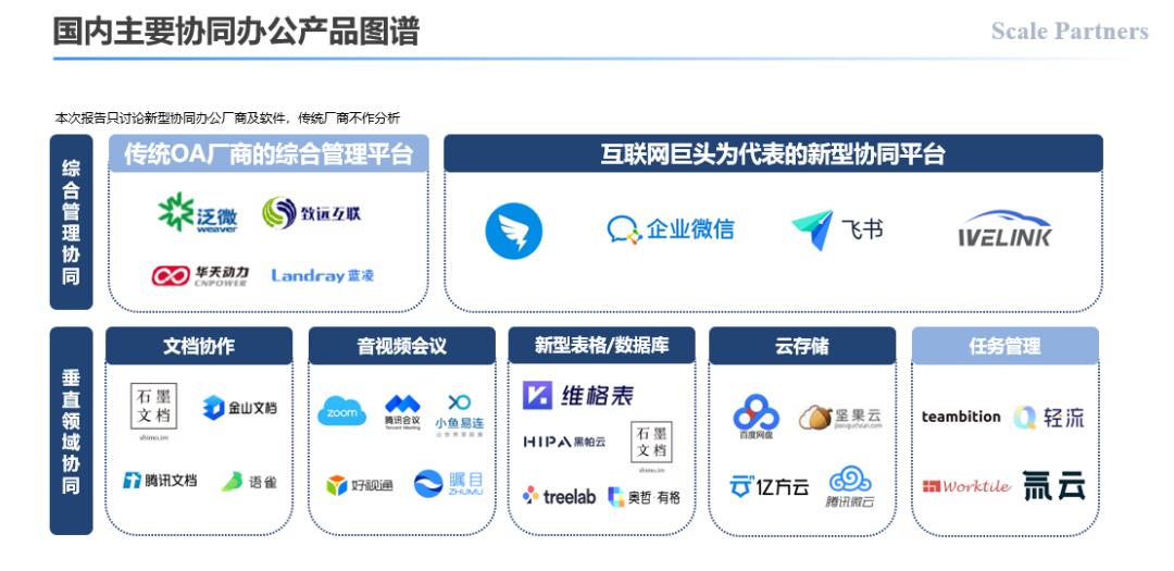 Scale Partners 势乘资本&光锥智能联合发布研报《2020年中国协同办公行业洞察报告》(以下简称《协同办公洞察报告》),从当下纷繁复杂的协同办公领域中,遴选出18家头部产品进行测评,覆盖文档协作、远程会议、新型表格/数据库、云存储以及综合协作类的管理平台等五大产品类别。