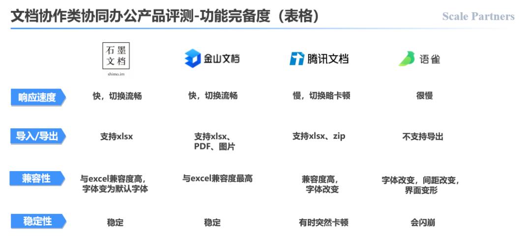 基于以上测试,我们可以得出,石墨文档与金山文档在功能完备度、对Office产品的兼容性、文件处理速度、权限设置上表现更加优秀,石墨文档在支持多人协同方面暂时领先。腾讯文档和语雀在功能完备度、对Office产品的兼容性、多人协同能力上暂时落后。