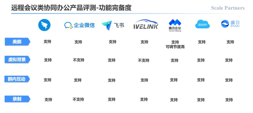 除基础功能外,各家产品在美颜、虚拟背景、群内互 动及录制等功能上也基本趋于一致,只有企业微信的会议系统目前不支持录制。从整体界面友好度以及基础功能上看,腾讯会议和ZOOM功能最完备,界面最友好,但ZOOM已经开始恢复付费使用,而腾讯会议在国内仍采取免费政策。