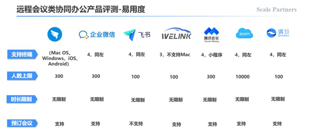 从远程会议产品的基本功能进行对比,各家在支持终端、参会人数上限及时长限制方面差异不大。除了飞书以外,各家均支持方便快速的预订会议,飞书支持在日历里添加日程再选择视频会议,操作比较麻烦。