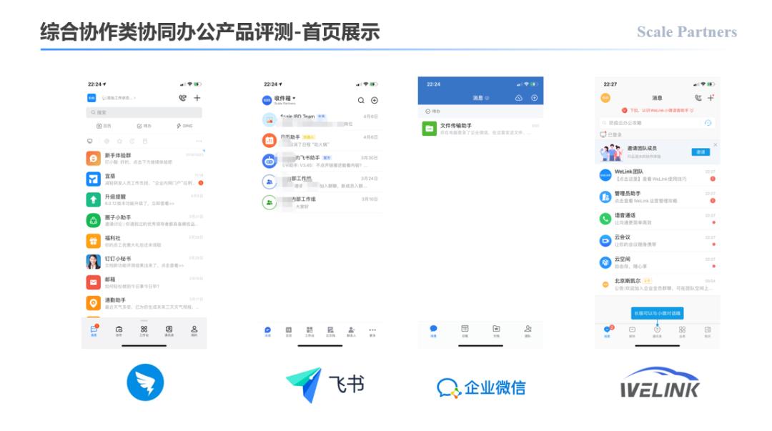 l 华为Welink上线时间较短,功能矩阵尚不完善,竞争力偏弱;垂直功能应用整体体验不如其他三家和垂直领域的专业协同办公软件;