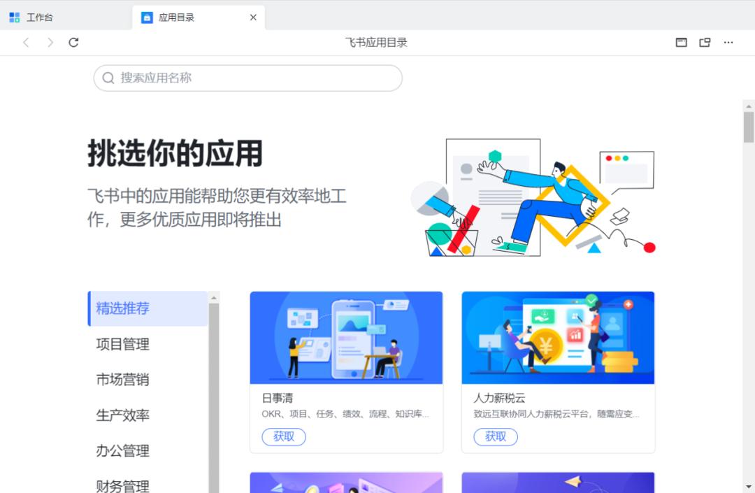 飞书自身附带约9种辅助功能,同样也打造了自己的应用中心,总体来看与钉钉应用市场中的数量与类别基本类似,囊括了企业日常办公场景所需的大部分办公应用,其中包括如OKR、轻流、墨刀、扫描全能王等。OKR管理系统是目前飞书上比较火的应用之一,也是字节内部管理比较出圈的功能之一。