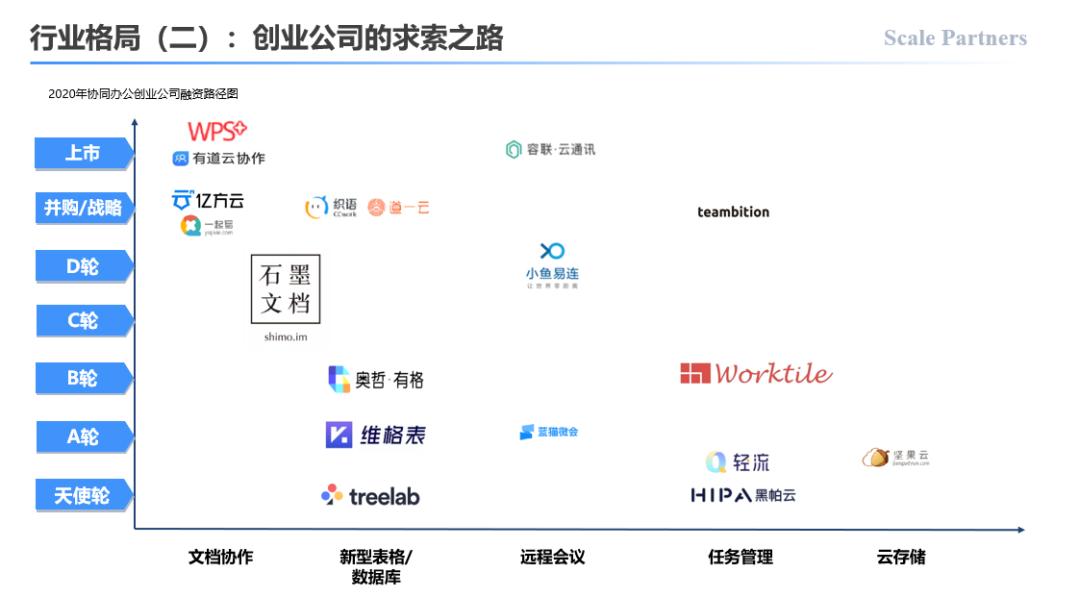 目前创业公司的业务规模和融资轮次普遍处于早期阶段,商业化落地尚在探索之中,而疫情之后资本热度升温,不少创业公司都拿到了融资。360收购亿方云、阿里收购Teambition、著名美元对冲基金Coatue领投石墨、腾讯投资小鱼易连……