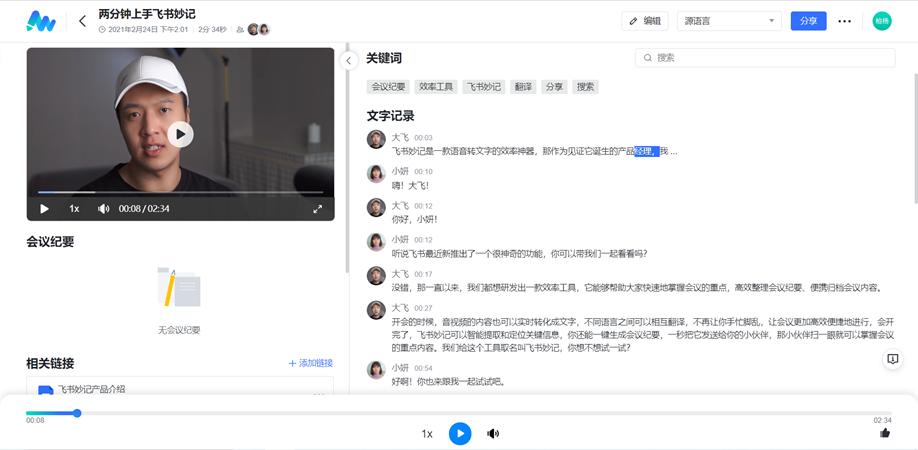 值得一提的是,飞书的会议系统开发出一个特色功能:飞书妙记。此项功能可以将整场会议的语音实时转化为文字,并自动识别发言者ID。该功能采用了目前市场上较成熟的NLP技术,实时语音识别效果较流畅;对于需要做会议纪要的朋友,该功能非常方便,不用再单独购买录音转文字软件,值得一试。