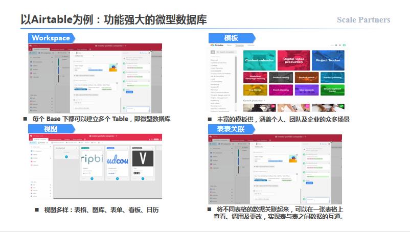 以代表产品Airtable为例,新型表格产品能将不同表格的数据关联起来,通过一张表格上的查看、调用及更改,实现表与表之间数据互通,另外它还为个人、团队、企业的多个使用场景提供了海量模板。