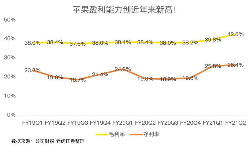 从过往的毛利率情况来看,苹果一直围绕在38%左右,即使在旺季,毛利率也不过是39.8%,而在Q2,苹果的毛利率达到42.5%,创近年来的历史新高。