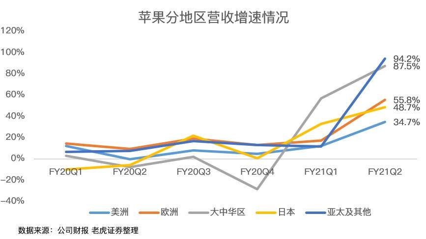 但上一财季,苹果在依靠大中华区玩命爆发的情况下,才支撑住营收增长21%,大本营美洲和第二大营收来源欧洲的营收增速表现并不好。