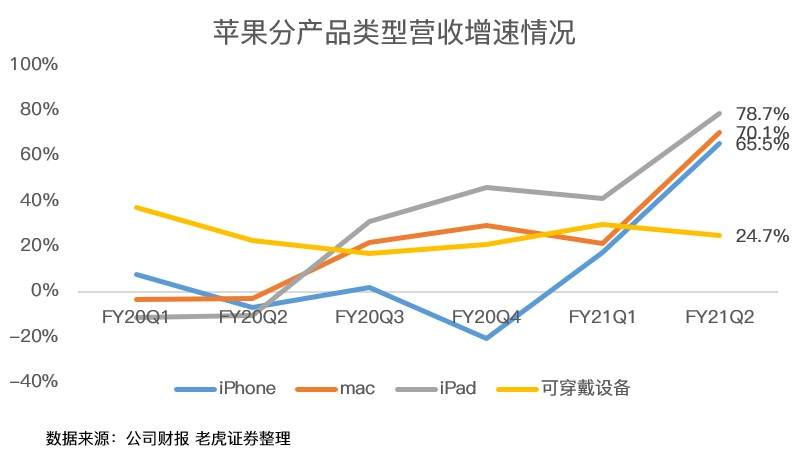 Mac和iPad都受益于疫情在家办公增加了需求,iPhone的增长主要是去年新发布的iPhone12以及换机需求的爆发。