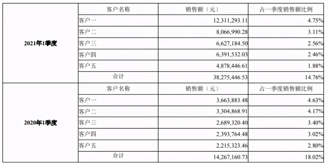 财报数据,2021年Q1,五个主要客户销售额约38.27亿元,占比为14.67%;去年一季度,五个主要客户销售额约14.26亿元,占比18.02%。销售额增长近一倍以上,但占比却下降。