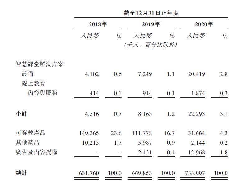 招股书显示,2018年至2020年,读书郎收入分别为6.32亿元、6.70亿元和7.34亿元,对应增速分别为6%和9.6%。其中,智能教育平板业务为读书郎的主要营收来源,这部分业务包括硬件设备以及平板内置的教育内容和服务。