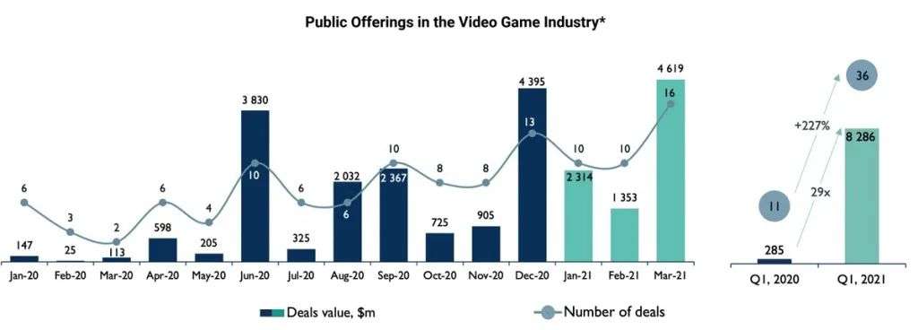 此外,游戏公司的公开上市交易数量(包括 SPAC、IPO 和直接上市)都呈现爆发式增长。InvestGame 表示,今年第一季度涉及的游戏公司上市交易共计 36 宗,价值超过 83 亿美元,比去年同期增长了 29 倍。