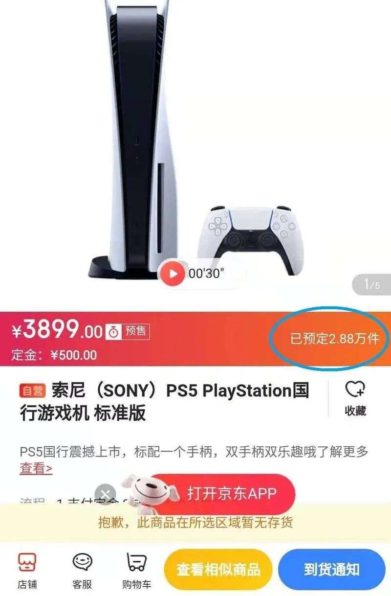 ▲4月29日下午17时,京东上国行PS5显示缺货,预定数量为2.88万台。图片:京东