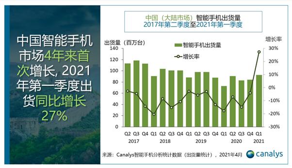 4月29日上午,市场调研机构Canalys最新发布一季度中国智能手机市场报告显示,中国智能手机市场出现四年来首次同比增长,2021年一季度出货量达9240万台,同比增长27%。