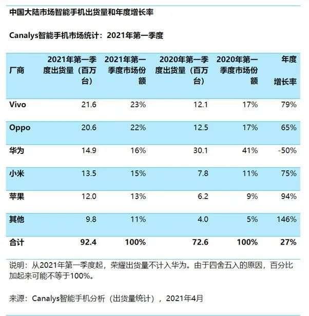 据Canalys最新报告,在疫情爆发一年后,中国大陆智能手机市场在今年一季度同比增长27%,出货量达到9240万部。
