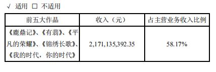 年报显示,公司2020年营业收入37.32亿,净利润3.99亿。剧集收入是华策实现逆势翻身的关键,34.19亿的电视剧销售额占营业收入的90%以上,《鹿鼎记》《有翡》《平凡的荣耀》《锦绣长歌》和《你的时代,我的时代》五部剧带来近60%的收入。