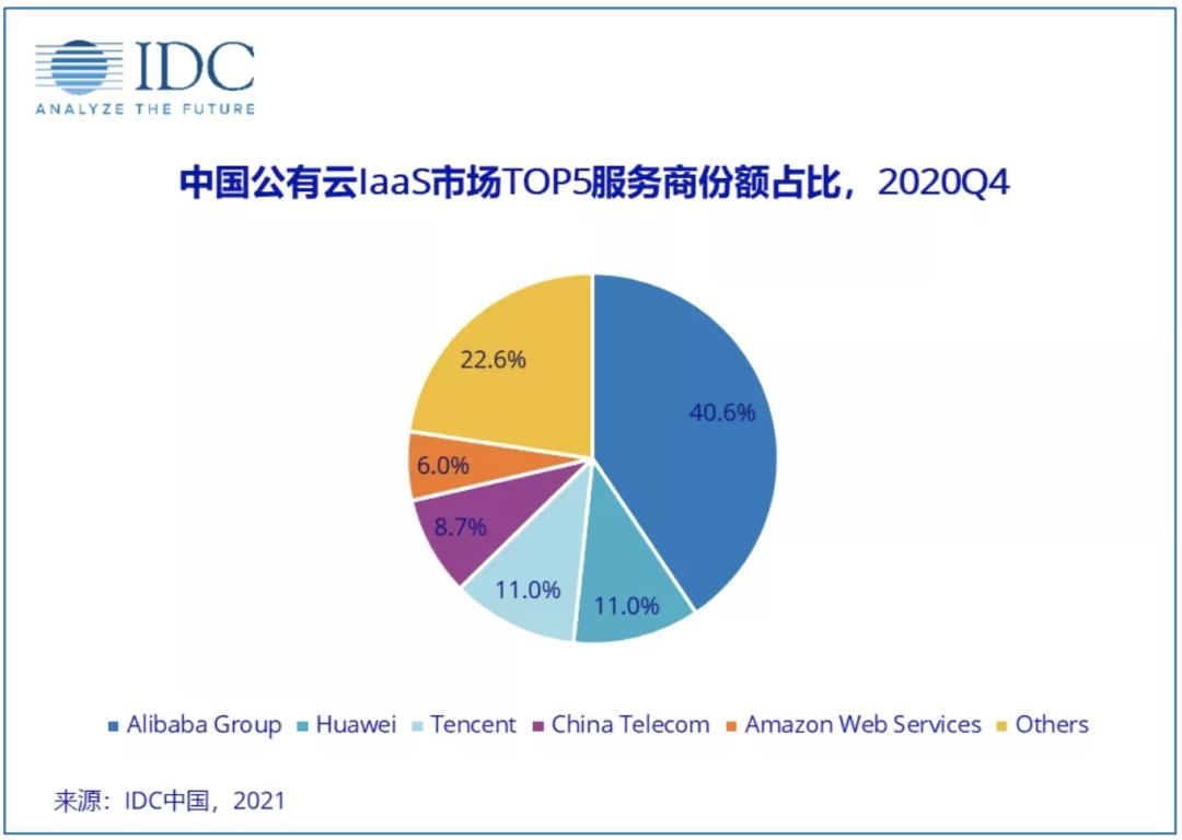 今年4月,IDC最新发布的《全球及中国公有云服务市场(2020年)跟踪》报告显示,2020年第四季度中国IaaS市场规模为34.9亿美元,阿里巴巴(40.6%)仍然占据市场份额第一的位置,华为的市场份额已经达到11%,与腾讯并列第二。