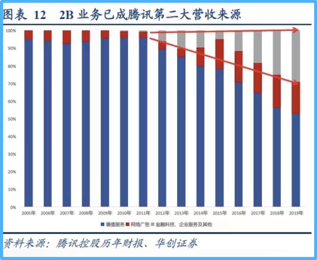 华创证券研究发现,2019年以前腾讯各类 2B 业务都属于“其他”分类,2019年中报首次修改为“金融科技及企业服务”。近年来,金融科技及企业服务(其他)占总收入的比例越来越高, 目前维持在 1/3 左右,成为腾讯第二大收入来源,且 2018-2020 年增长率均高于腾讯的整体营收增长率。