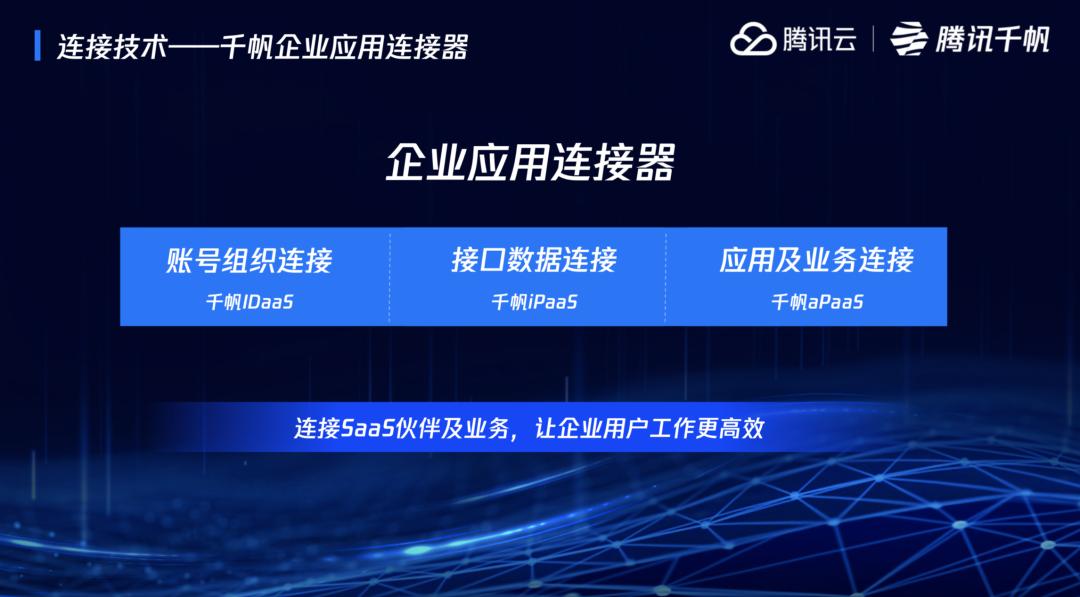 4月26日,腾讯公布了新的SaaS生态战略,在产品技术方面,将聚合腾讯千帆IDaaS、iPaaS和aPaaS产品,推出“企业应用连接器”,帮助SaaS厂商提升交付和开发效率,打通帐号、数据及应用之间的壁垒。