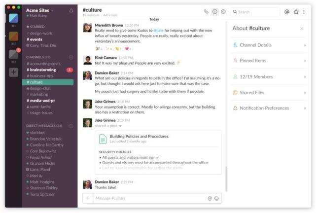 Slack将用户业务的所有活动部分集中在一个地方。此外,它还与其他几十种工具集成,从Box到Google Drive。通过Slack,用户可以共享文件和文档;通过信息或一对一在小组中发言;享受几十个集成,或者使用应用编程接口进行自己的集成;安全传输数据的访问加密;使用双向音频和视频通话;对之前的对话进行全面搜索;创建完整的用户配置文件。对于同事之间的快速聊天和持续对话,Slack无疑是一款出色的工具。