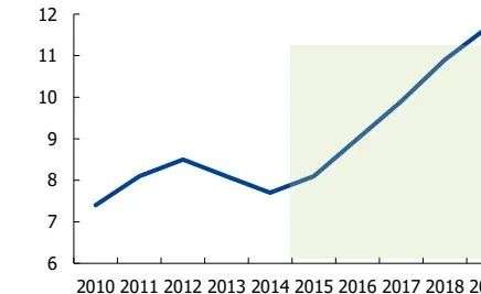 根据国金证券数据,包装饮用水的市场规模在2000亿元左右,过去几年的复合增速保持在 10%以上,其预计行业 2019-2024 年的 CAGR为15%,且农夫山泉的未来三年市占率会从 19 年的 20.9%提升至 22%、23%、24%。