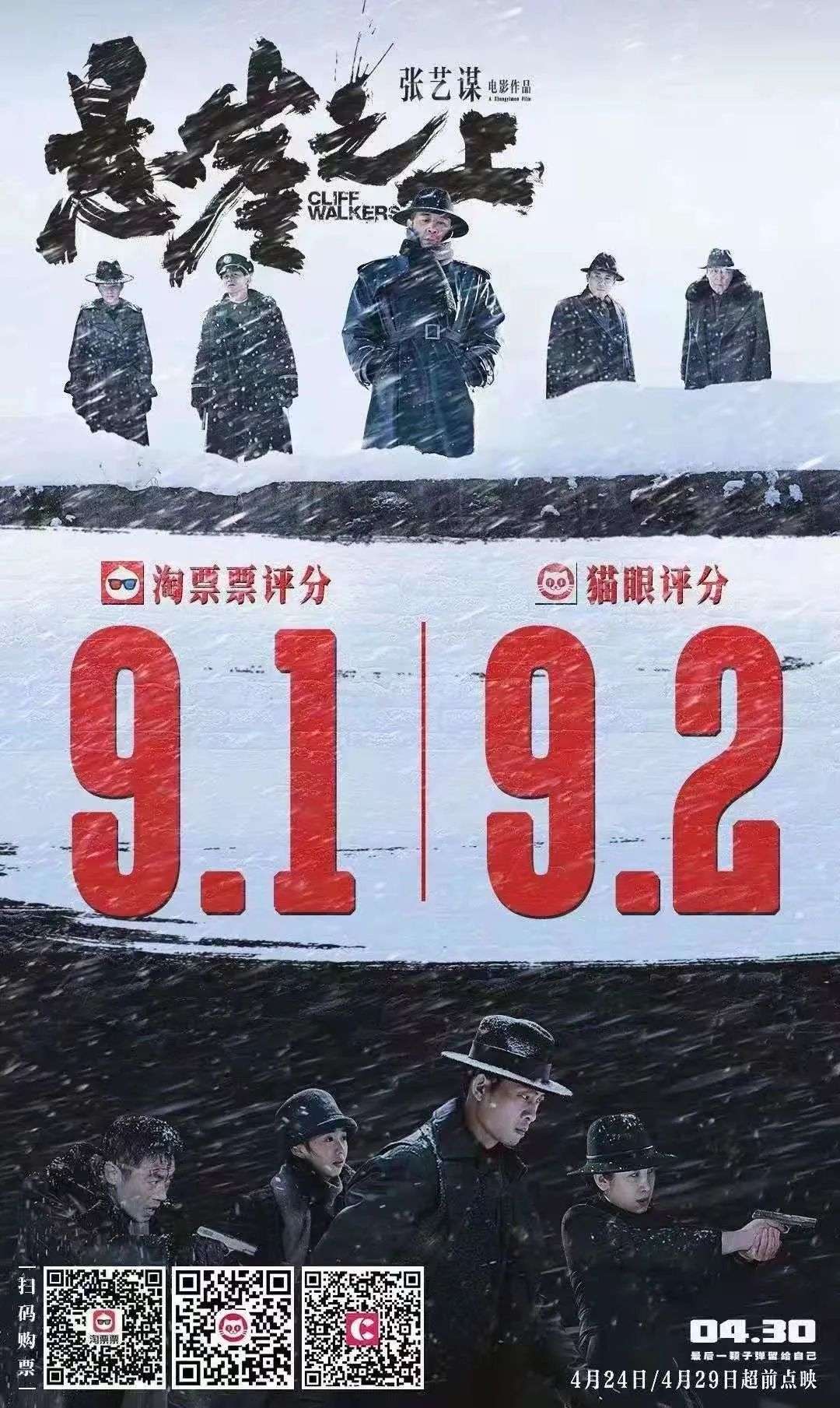 于是,在4月18日、4月24日、4月29日,《悬崖之上》开放了三轮点映,抖音热度陡涨,从4月18日的5990万涨到了4月24日7543万,并获得了1172.3万点映票房(截止4月29日16:04)。在口碑上,《悬崖之上》也取得不俗成绩,淘票票评分9.1,猫眼评分9.2。