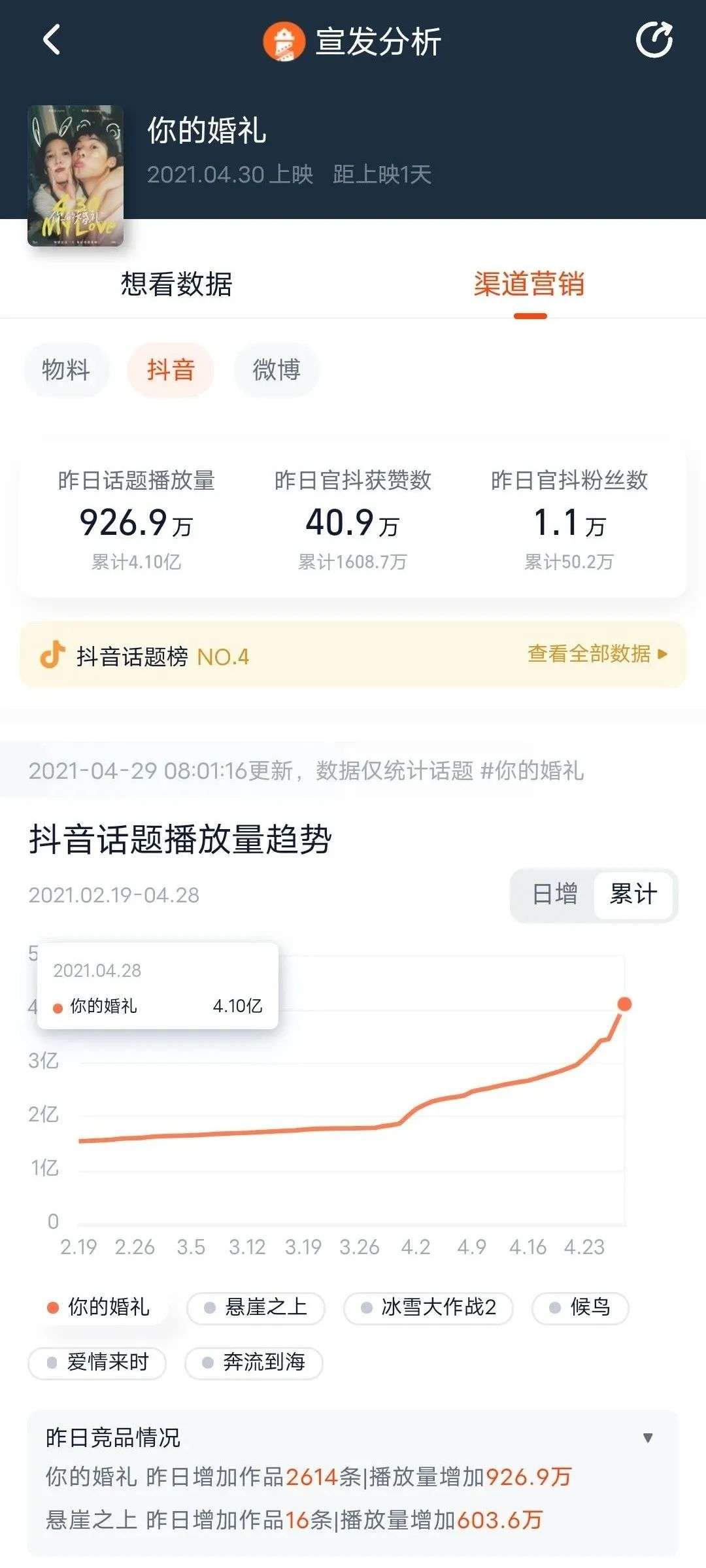 《你的婚礼》从2月19日起,抖音话题播放量一路走高,截至4月28日累计播放量已经高达4.1亿。
