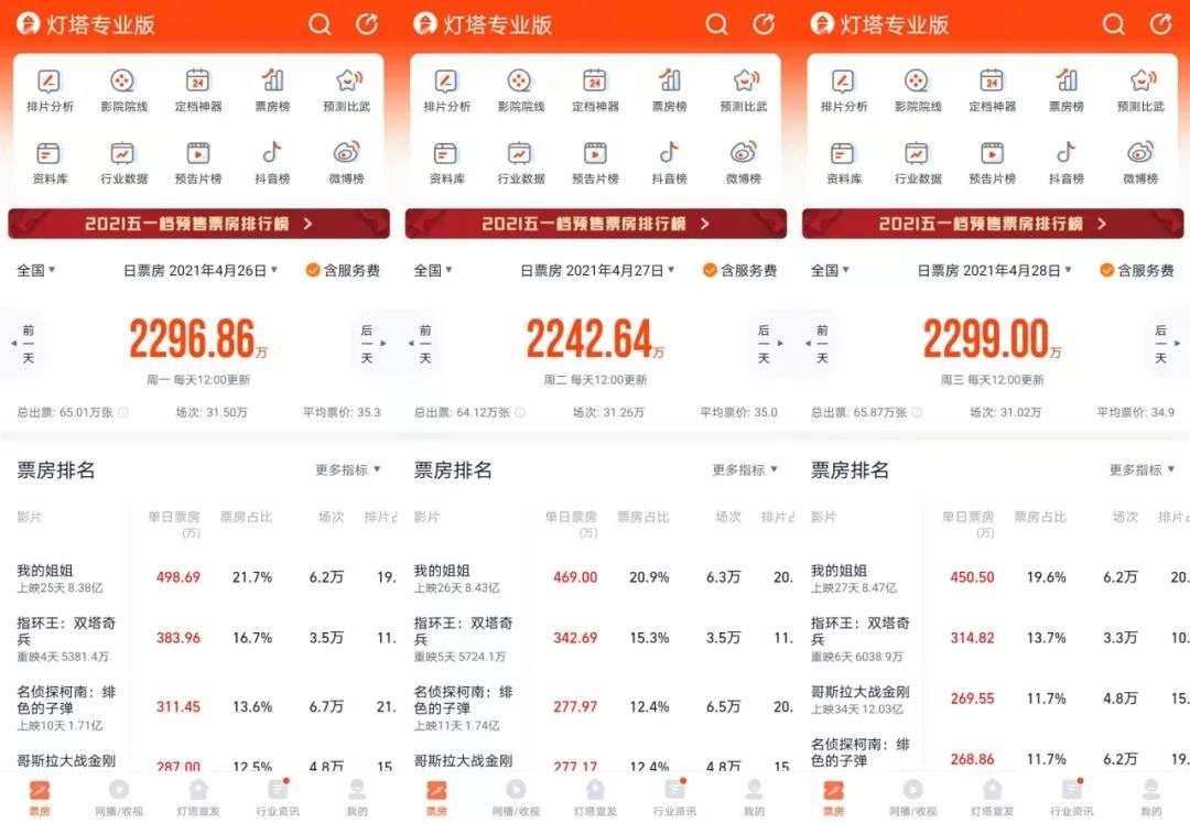 五一档之前,工作日大盘一直刷新新低。4月26日周一,大盘2296.86万; 4月27日周二,大盘2242.64万; 4月27日周三,大盘2299万。定档节假日,已经势在必行。