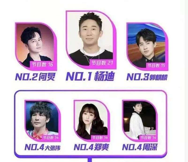 去年杨迪、何炅、郭麒麟、大张伟、周深等艺人在十几档甚至几十余档综艺节目上常驻、“飞行”,其中杨迪参与21档综艺节目“一举夺魁”。他们与综艺节目的高度适配,也让这些艺人一举成为名副其实的“综艺咖”。