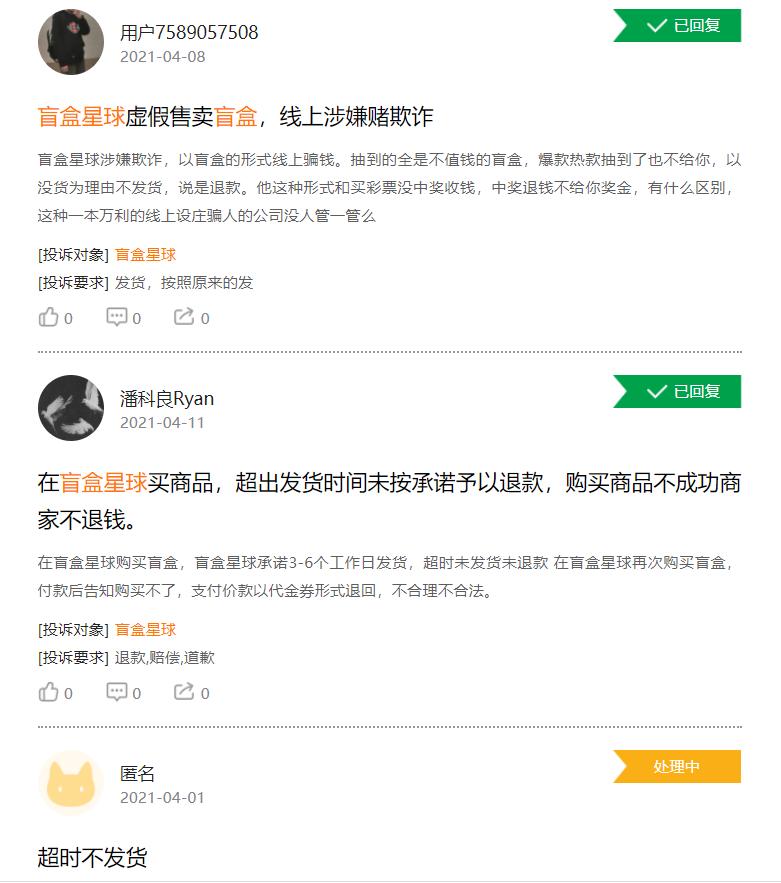 黑猫投诉上用户对盲盒星球的质疑,图源黑猫投诉