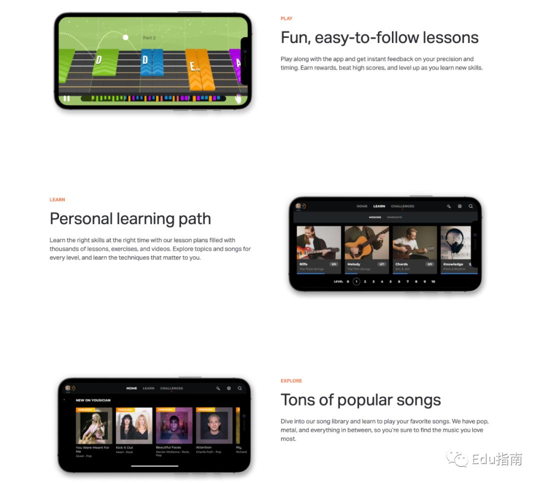 Yousician平台支持吉他、钢琴、贝斯、尤克里里和唱歌交互式学习。Yousician的音频技术支持收听真实的原声音乐或电吉他,而无需使用其他设备。在交互上,“使用游戏化的方式与吉他练习相结合,使学习过程变得轻松,有趣。”