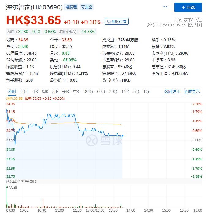 财报发布第二天,投资者并未表现过多的惊喜,截至发稿,股价报33.65港元,涨幅0.3%。