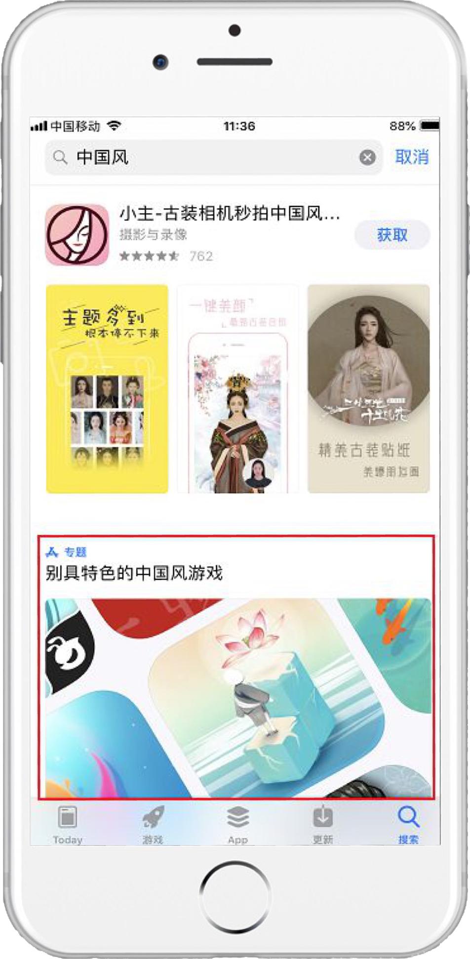 再比如,2018年9月,苹果调整了中国区App Store搜索结果的展示形式,关键词搜索结果下出现了“专题”(即story,现在多以“故事”的名字出现)。虽然专题/故事在搜索结果的排名并不固定,而且搜索不同的关键词时,同一专题/故事的展示的位置也不一样,但其排名还是比较靠前的。此次调整无疑又为App提供了一个免费的曝光位。