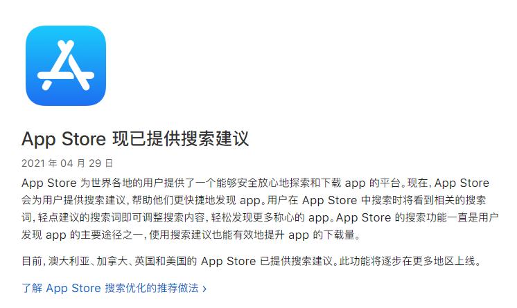 4月29日,苹果正式在App Store推出“搜索建议”功能。该功能将允许用户通过系统主动推送的标签来发现应用。目前已在澳大利亚、加拿大、美国和英国区的App Store上线,且将逐步拓展到更多国家/地区的App Store中。