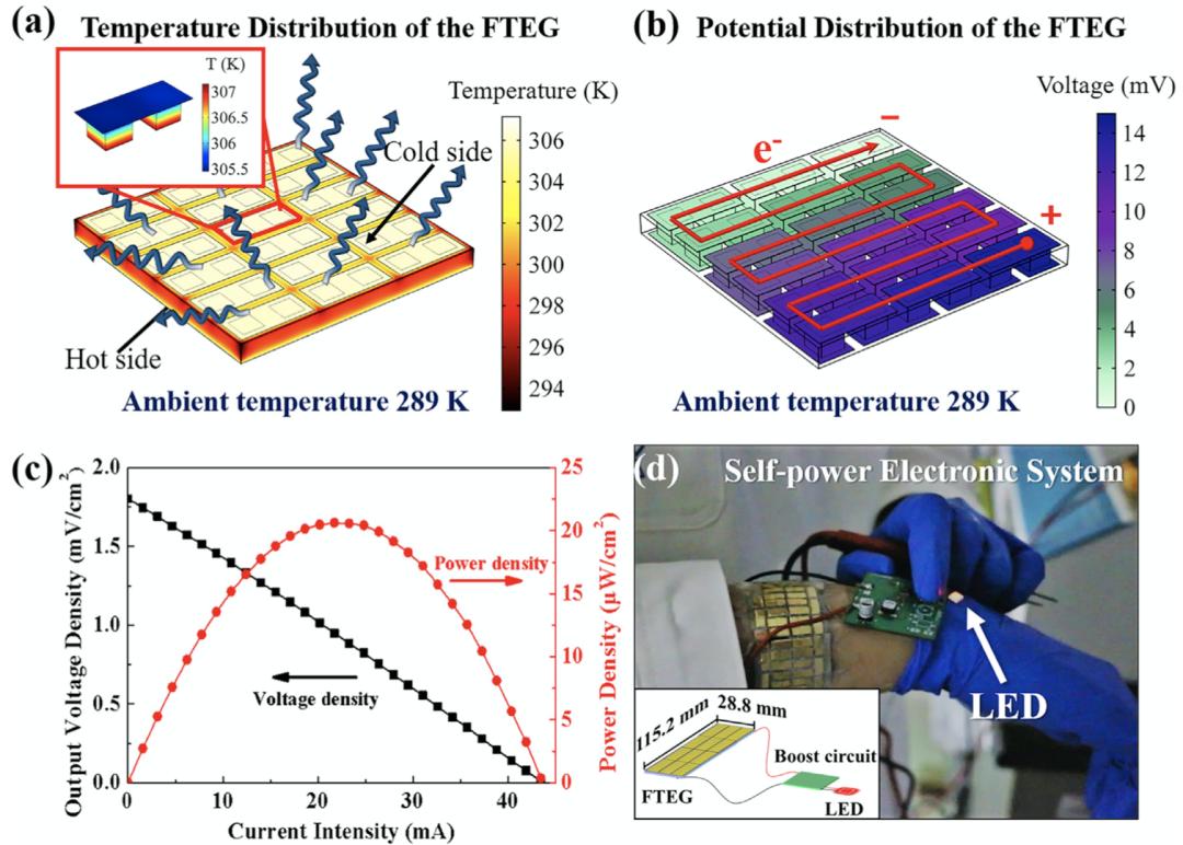 基于赛贝克效应,输出电压会随着温差的增加而成比例增加,输出功率密度是在 10–50K 的不同温度下以 10K 的间隔获得的,由产生的功率除以 FTEG 设备模块的总面积计算得出。研究人员最终测得,在 289K 的环境温度下,FTEG 可提供高达每平方厘米 20.6 微瓦(µW)的电压,测量的开路电位为 14.9 毫伏(mV),电压密度为每平方厘米 18.0 毫伏(mV)。