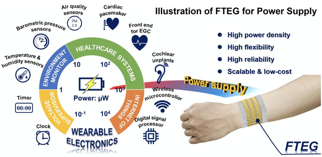 研究人员在结论中展望,这是一种低成本和可规模制备的 FTEG 穿戴,下一步,将根据功率要求和环境条件设计具有不同填充因子的 FTEG,比如集成其他功能的电子元件:脉冲测试、肌肉氧测试或无线传输等。